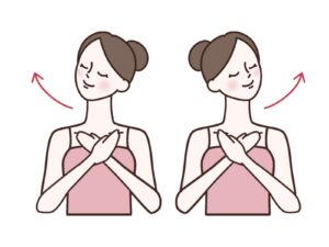 顔を右斜め上に向け、左手で左の鎖骨を軽く押さえます。
