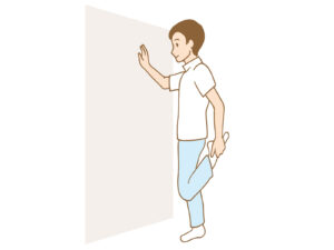 立った状態で片足の足首を持ち、かかとをお尻に近づけるように膝を曲げます。