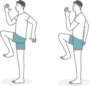 その場で膝を高く上げる「ももあげ運動」を20回、かかとをお尻に近づける「かかとあげ運動」を20回行います。