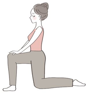 「腸腰筋のストレッチ」は、片膝立ちの姿勢から、前の膝を曲げながら腰を前に押し出します。