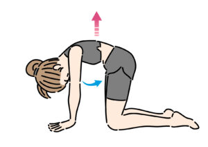 四つん這いの姿勢から、背中を丸めたり反らしたりを10回繰り返すことで、腰椎の動きを滑らかにし、筋肉の緊張をほぐせます。