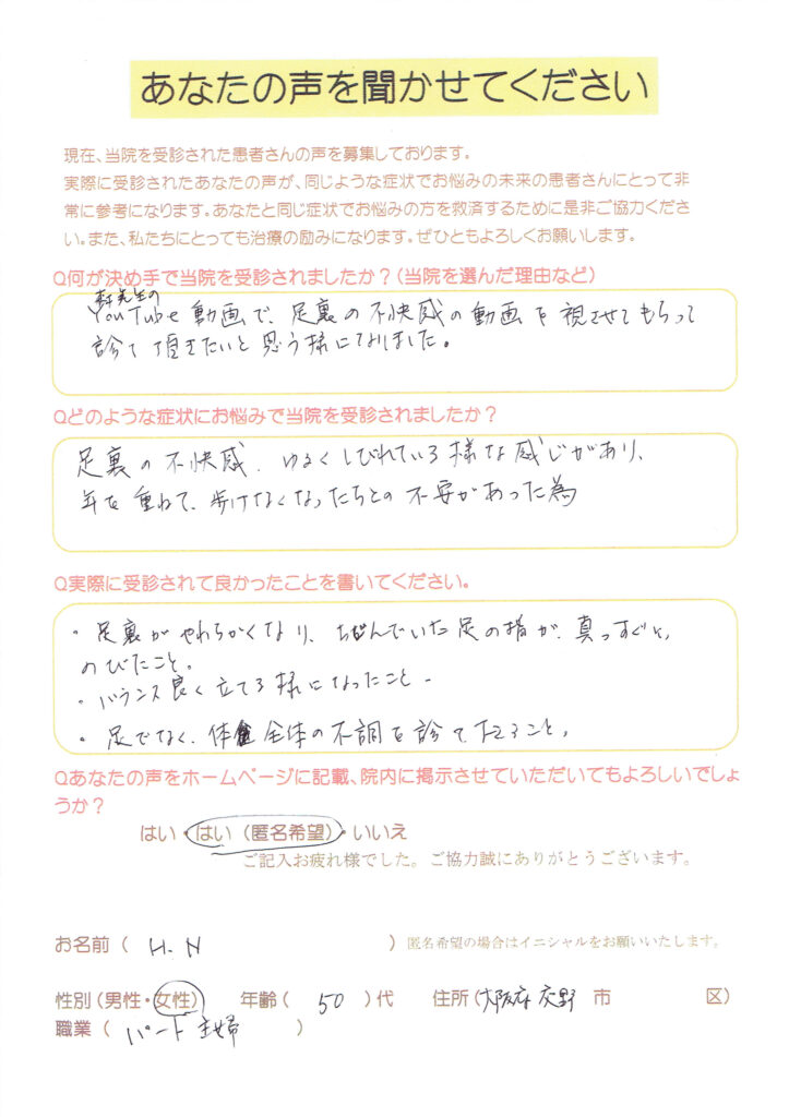 森先生の動画で、足裏の不快感の動画を見させてもらって診ていただきたいと思うようになりました。