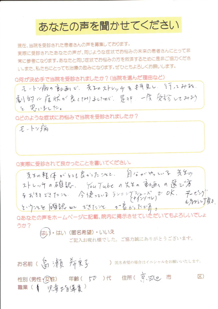 モートン病の動画で、先生のストレッチを拝見し、行ってみると劇的に症状が良くなりましたので、