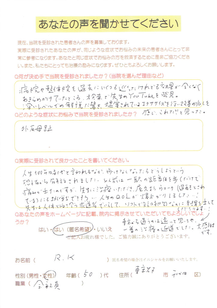 東京都内で整体に通うも改善されず、YouTubeの動画をきっかけに遠方からお越しくださいました。
