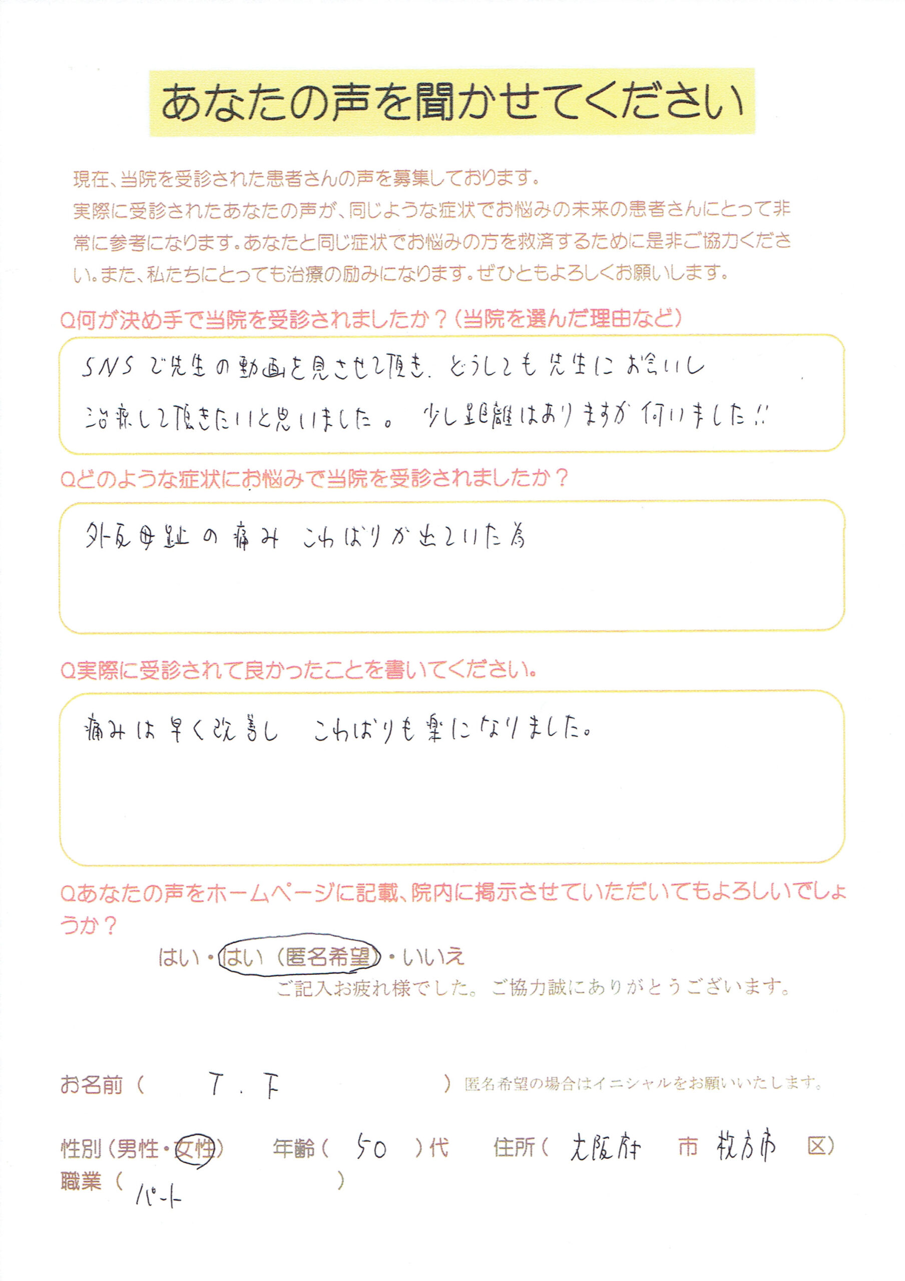 【外反母趾】「痛みは早く改善しこわばりも楽に」 50代女性 (大阪府枚方市)