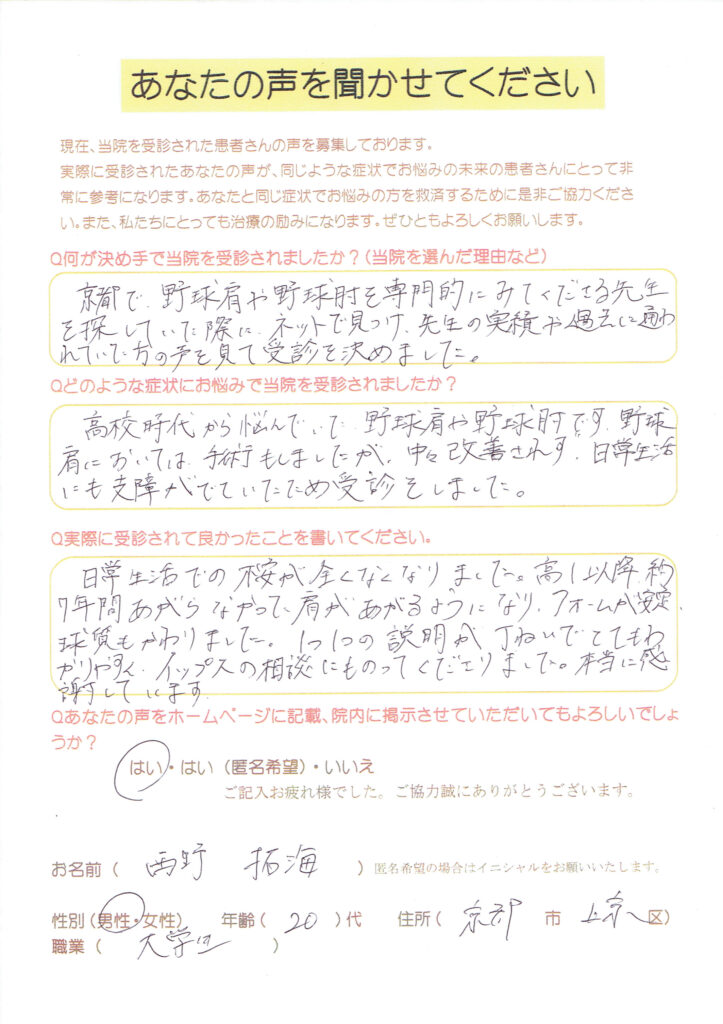 京都で、野球肩や野球肘を専門的にみてくださる先生を探していた際に