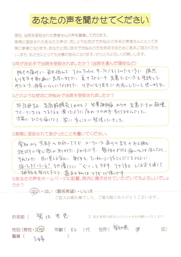 愛知から京都へ出向いてでもユーチューブ通りの先生のお人柄と施術に安心感がありました。