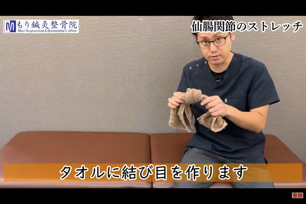 タオルを1枚用意してください。タオルを用意したら、結び目をキュッと作ります。この結び目の玉を仙腸関節に当てて刺激していくというセルフケアを行います。