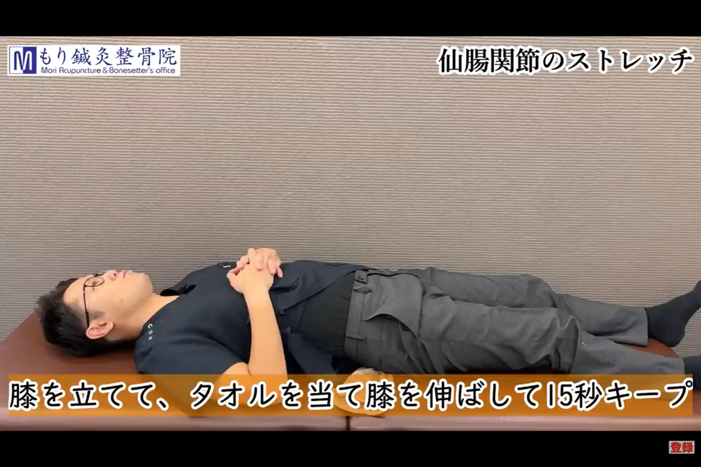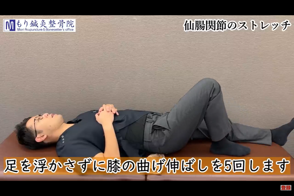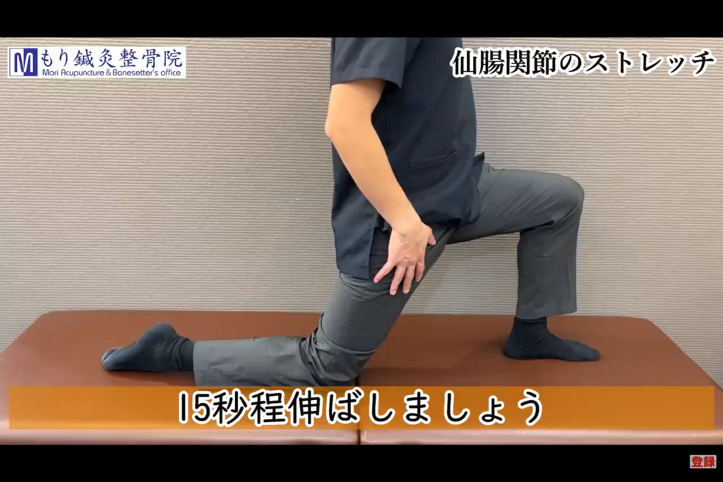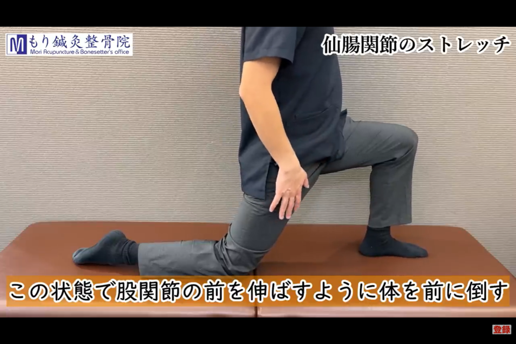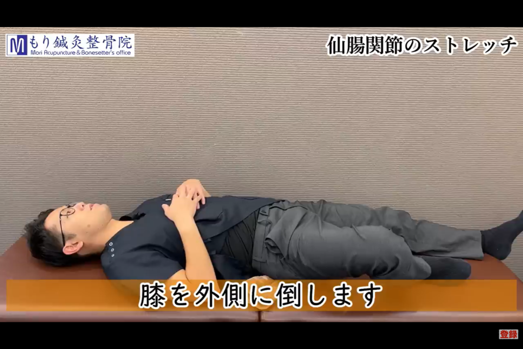 反対の膝に手を置いて、ぐーっと伸ばしてもらっても結構です。太ももを後ろに引くことで、仙腸関節を動かしています。