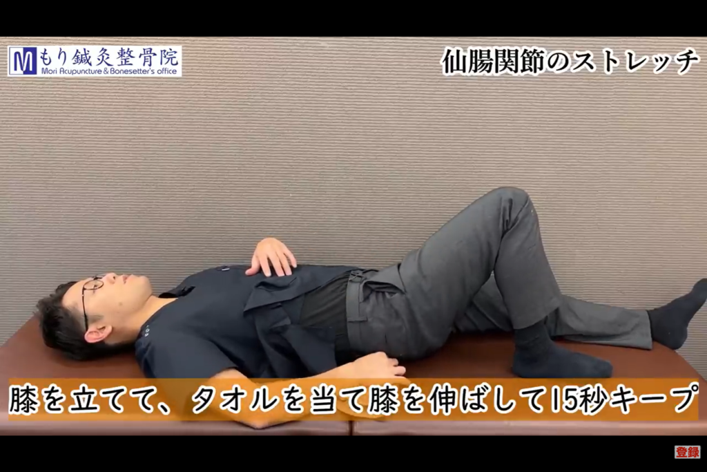 あまり下の方にタオルを入れているとずれることがありますし、上の方に入れていると仙腸関節にかからないので、しっかりと仙腸関節が刺激される位置にタオルを入れてください。