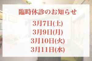 3月7日(土)から11日(水)まで臨時休診となります